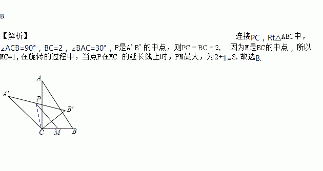 如图,在Rt△ABC中,∠ACB=90°,将△ABC绕顶点C逆时针旋转得到△A'B'C,M是BC的中点,P是A'B'的中点,连接PM.若BC=2,∠BAC=30°,则线段PM的最大值是( )
