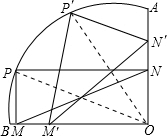 如图,在90°的扇形AOB中有矩形PMON,P为弧AB上的动点,点M、N分别在半径BO、AO上,当P点运动到P′时,M、N也随之移动到M′、N′,若保持四边形P′M′ON′是矩形,试判断MN与M′N′的大小关系,并说明理由.