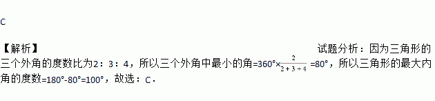 C 【解析】试题分析:因为三角形的三个外角的度数比为2:3:4,所以三个外角中最小的角=360°×=80°,所以三角形的最大内角的度数=180°-80°=100°,故选:C.