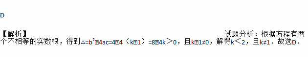 A. k<﹣2 B. k<2 C. k>2 D. k<2且k≠1