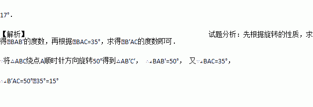 如图所示,△ABC中,∠BAC=33°,将△ABC绕点A按顺时针方向旋转50°,对应得到△AB′C′,则∠B′AC的度数为_________.