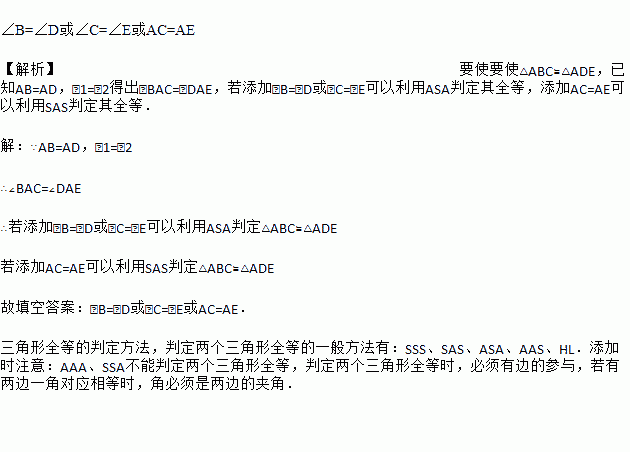 如图,已知AB=AD,∠1=∠2,要使△ABC≌△ADE,还需添加的条件是_____(只需填一个)
