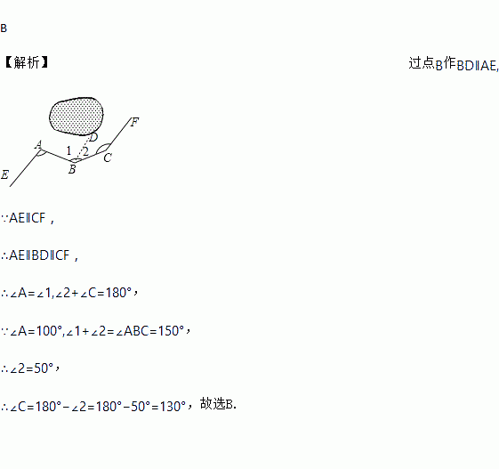 如图,一条公路修到湖边时,需拐弯绕道而过,如果第一次拐的 角∠A是100°第二次拐的角∠B是150°,第三次拐的角是∠C, 这时的道路恰好和第一次拐弯之前的道路平行,则∠C是( ).