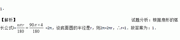 1. 【解析】试题分析:根据扇形的弧长公式l==2π,设底面圆的半径是r,则2π=2πr,∴r=1.故答案为:1.