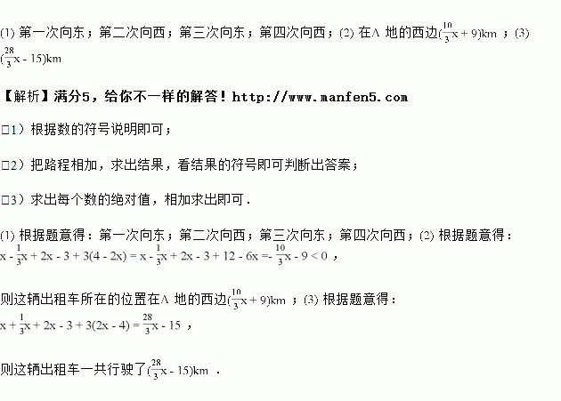 一辆出租车从地出发,在一条东西走向的街道上往返,每次行驶的路程(记向东为正)记录如下![]()