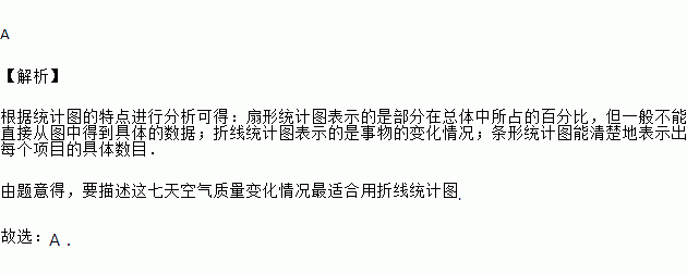 新区四月份第一周连续七天的空气质量指数(AQI)分别为:118,96,60,82,56,69,86,则这七天空气质量变化情况最适合用哪种统计图描述( )