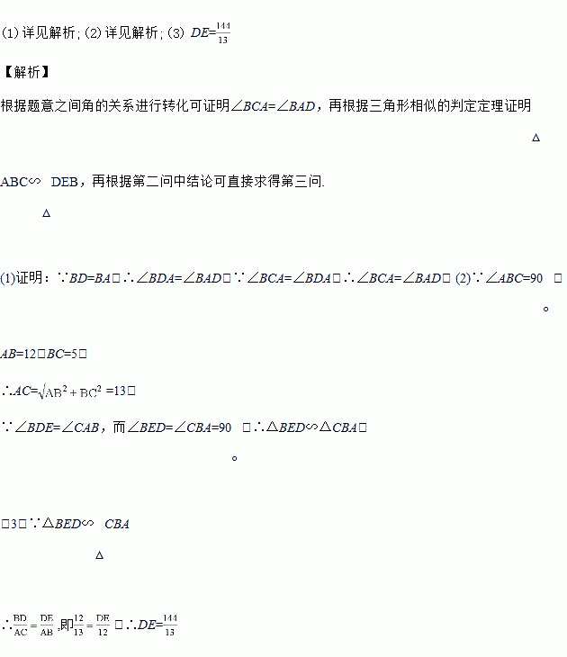 如图,⊙O 是直角△ABC 的外接圆,∠ABC=90? ,AB=12,BC=5, 弦 BD=BA,BE 垂直 DC 的延长线于点 E,