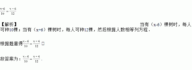 某校组织一些学生种一批树,若每人种10棵,则剩6棵未种;若每人种12棵,则缺6棵树苗.设有x棵树苗,则可列方程__________________.