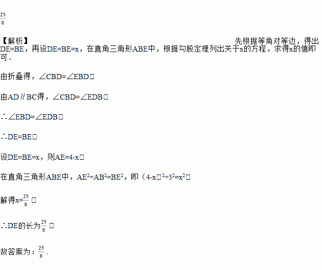 如图,将矩形ABCD沿对角线BD所在直线折叠,点C落在同一平面内,落点记为C’,BC’与AD交于点E,若 AB=3,BC=4,则DE的长为_______________.