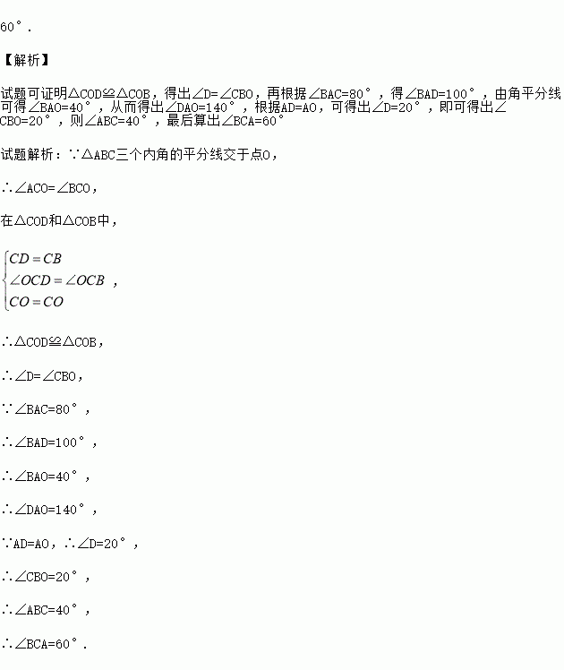 如图,已知△ABC三个内角的平分线交于点O,点D在CA的延长线上,且DC=BC,AD=AO,若∠BAC=80°,则∠BCA的度数为 .