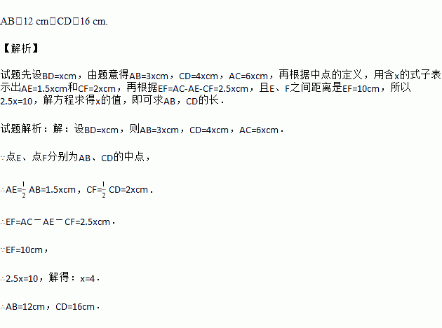 如图,已知线段AB和CD的公共部分BD=AB=CD,线段AB、CD的中点E、F之间距离是10cm,求AB,CD的长.