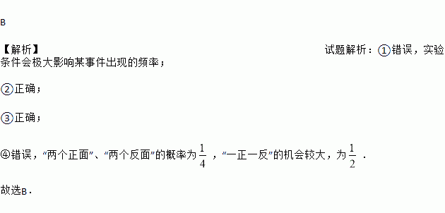 B 【解析】试题解析:①错误,实验条件会极大影响某事件出现的频率; ②正确; ③正确; ④错误,“两个正面”、“两个反面”的概率为,“一正一反”的机会较大,为. 故选B.
