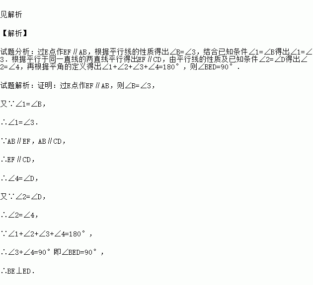 已知,如图,AB∥CD,∠1=∠B,∠2=∠D.求证:BE⊥DE.