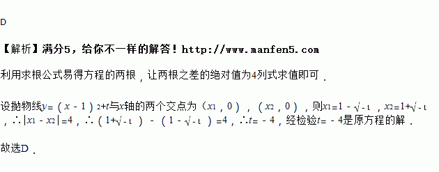 抛物线y=(x﹣1)2+t与x轴的两个交点之间的距离为4,则t的值是( )