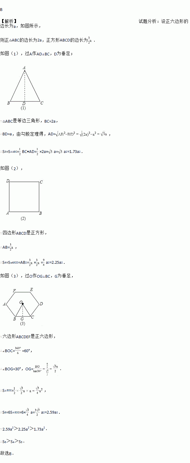 周长相等的正三角形、正四边形、正六边形的面积S3、S4、S6间的大小关系是( )