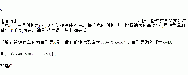 某农产品市场经销一种销售成本为40元的水产品.据市场分析,若按每千克50元销售,一个月能售出500千克;销售单价每涨一元,月销售量就减少10千克.设销售单价为每千克x元,月销售利润为y元,则y与x的函数关系式为( )