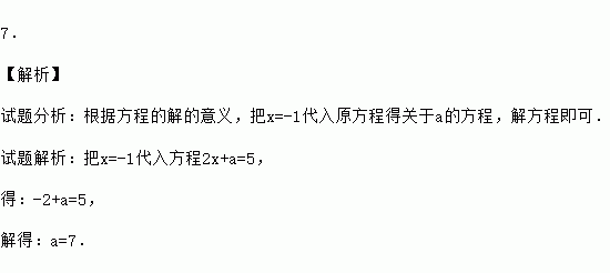 7. 【解析】 试题分析:根据方程的解的意义,把x=-1代入原方程得关于a的方程,解方程即可. 试题解析:把x=-1代入方程2x+a=5, 得:-2+a=5, 解得:a=7.