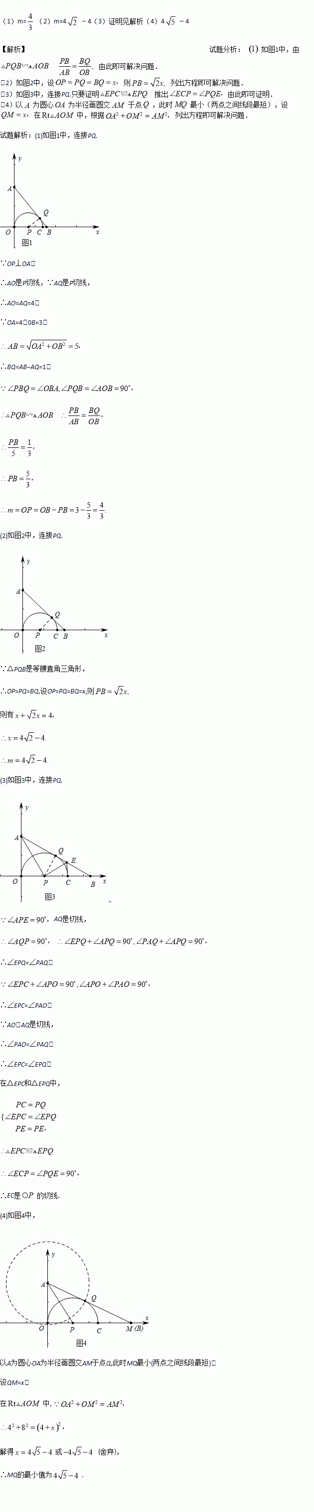 平面直角坐标系中,A(0,4),点P从原点O开始向x轴正方向运动,设P点横坐标为m,以点P为圆心,PO为半径作⊙P交x 轴另一点为C,过点A作⊙P的切线交 x轴于点B,切点为Q.