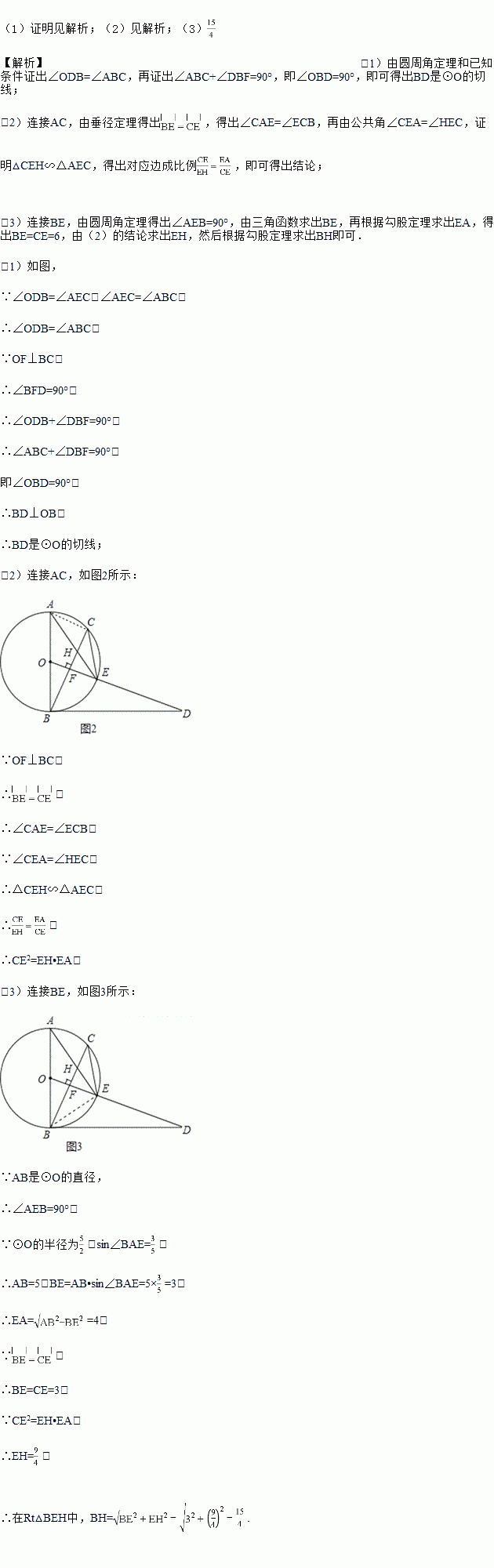 已知,如图,AB是⊙O的直径,点C为⊙O上一点,OF⊥BC于点F,交⊙O于点E,AE与BC交于点H,点D为OE的延长线上一点,且∠ODB=∠AEC.