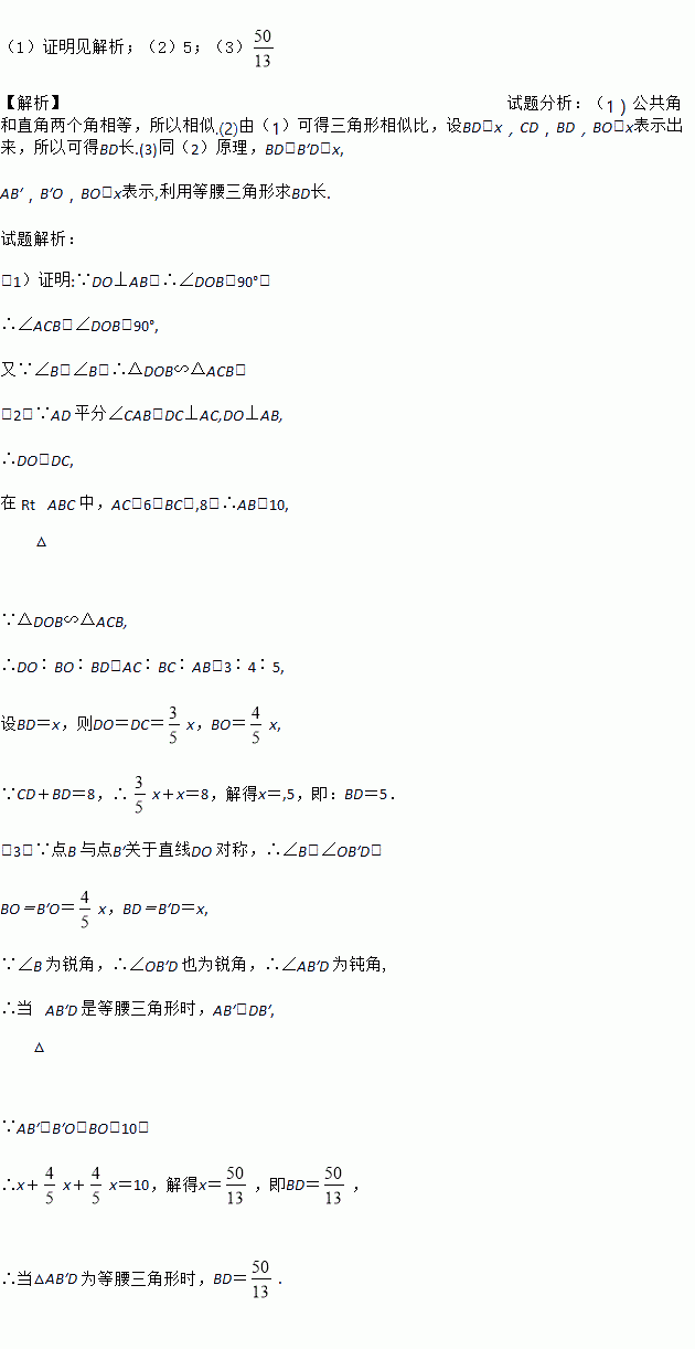 如图,在Rt△ABC中,∠ACB=90°,AC=6,BC=8,点D为边CB上的一个动点(点D不与点B重合),过D作DO⊥AB,垂足为O,点B′在边AB上,且与点B关于直线DO对称,连接DB′,AD.