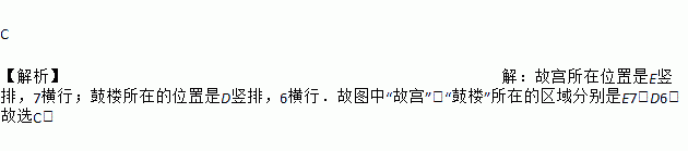 如图是沈阳市地区简图的一部分,图中“故宫”、“鼓楼”所在的区域分别是( )