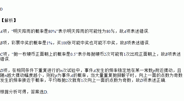 D. “抛一枚普通的正方体骰子,出现朝正面的数为奇数的概率是”表示如果这个骰子抛很多很多次,那么平均每![]()