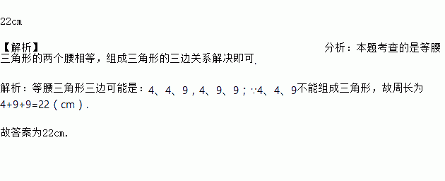 22cm 【解析】分析:本题考查的是等腰三角形的两个腰相等,组成三角形的三边关系解决即可. 解析:等腰三角形三边可能是:4、4、9,4、9、9;∵4、4、9不能组成三角形,故周长为4+9+9=22(cm). 故答案为22cm.