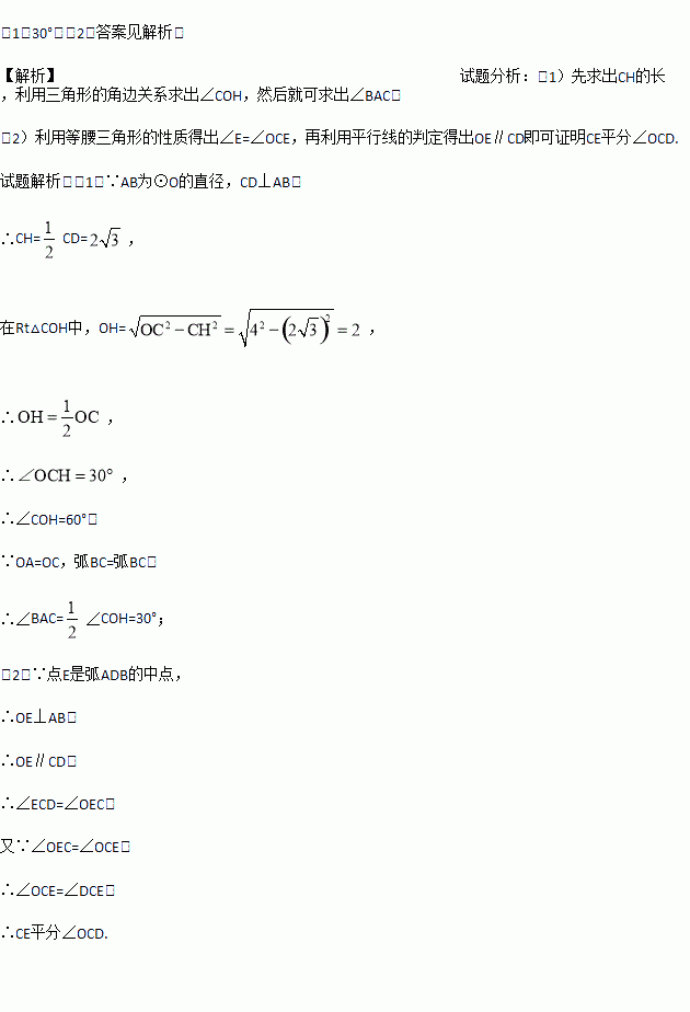 (2)若点E为弧ADB的中点,连接OE,CE.求证:CE平分∠OCD.