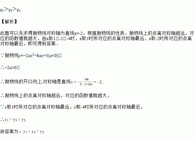 已知点(1,y1)、(﹣2,y2)、(﹣4,y3)都是抛物线y=﹣2ax2﹣8ax+3(a<0)图象上的点,则y1,y2,y3的大小关系是_____