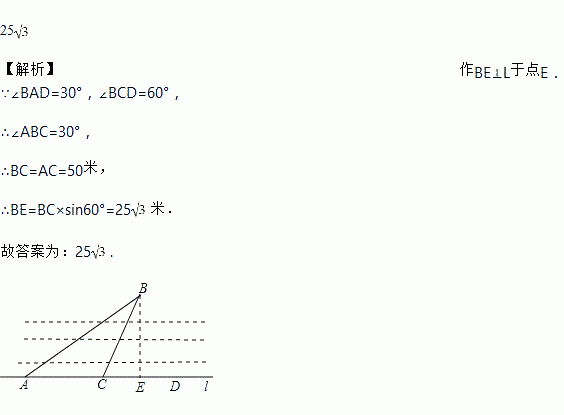 如图,小明要测量河内小岛B到河边公路l的距离,在A点测量∠BAD=30°,在C点测得∠BCD=60°,又测得AC=50米,则小岛B到公路l的距离为______米.