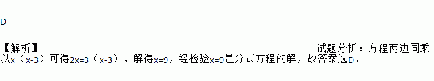 D 【解析】试题分析:方程两边同乘以x(x-3)可得2x=3(x-3),解得x=9,经检验x=9是分式方程的解,故答案选D.