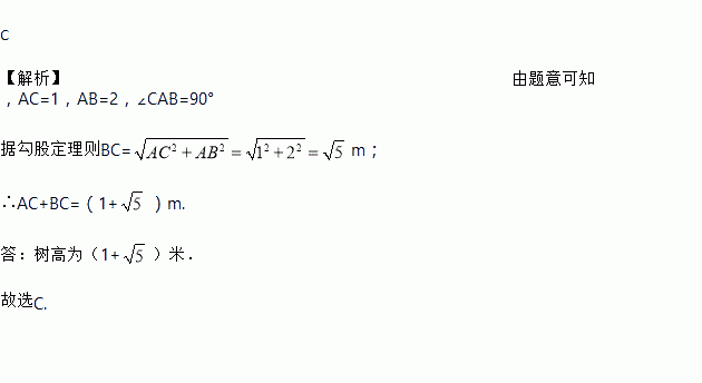 如图,一场暴雨过后,垂直于地面的一棵树在距地面1米处折断,树尖B恰好碰到地面,经测量AB=2m,则树高为( )米