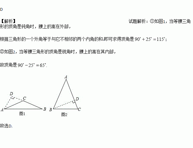 等腰三角形一腰上的高与另一腰的夹角为25°,则顶角的度数为( )