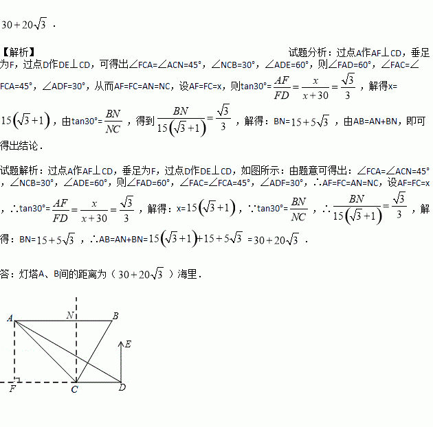 海中两个灯塔A、B,其中B位于A的正东方向上,渔船跟踪鱼群由西向东航行,在点C处测得灯塔A在西北方向上,灯塔B在北偏东30°方向上,渔船不改变航向继续向东航行30海里到达点D,这时测得灯塔A在北偏西60°方向上,求灯塔A、B间的距离.(计算结果用根号表示,不取近似值)