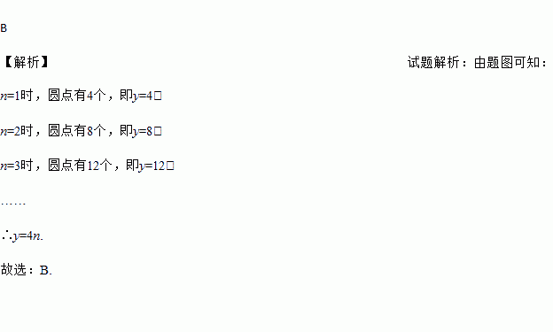 图中的圆点是有规律地从里到外逐层排列的.设y为第n层(n为正整数)圆点的个数,则下列函数关系中正确的是( )