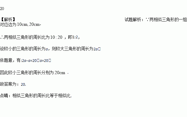 两个相似三角形的对应边分别是10cm和20cm,它们的周长相差20cm,则较小三角形的周长是_____cm.
