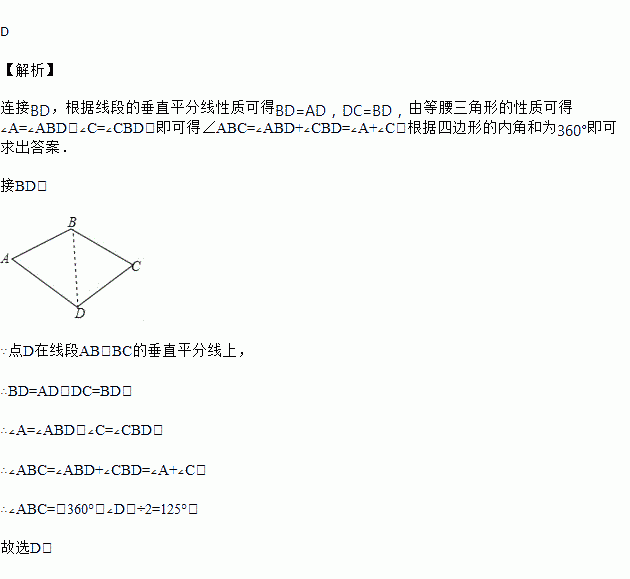 如图,在四边形ABCD中,点D在线段AB、BC的垂直平分线上,若∠D=110°,则∠B度数为( )