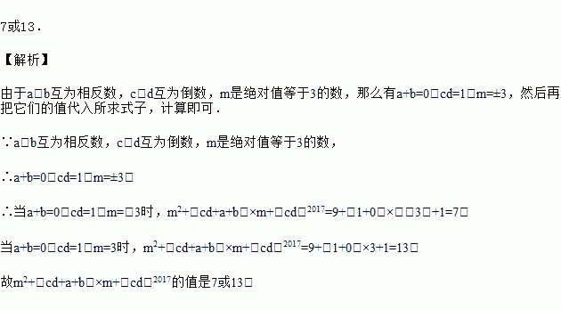 已知a,b互为相反数,c,d互为倒数,m是绝对值等于3的数,求代数式m2+(cd+a+b)×m+(cd)2017的值.