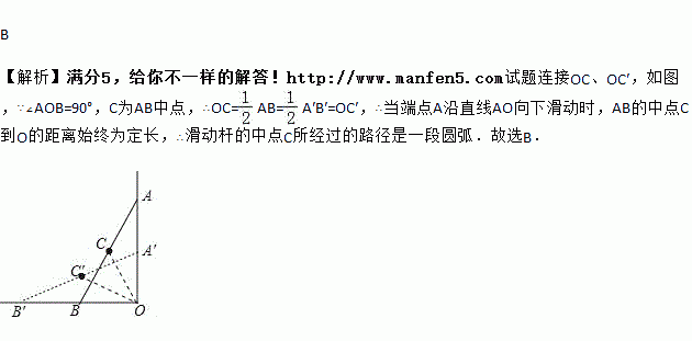 如图,在直角∠O的内部有一滑动杆AB,当端点A沿直线AO向下滑动时,端点B会随之自动地沿直线OB向左滑动,如果滑动杆从图中AB处滑动到A′B′处,那么滑动杆的中点C所经过的路径是( )