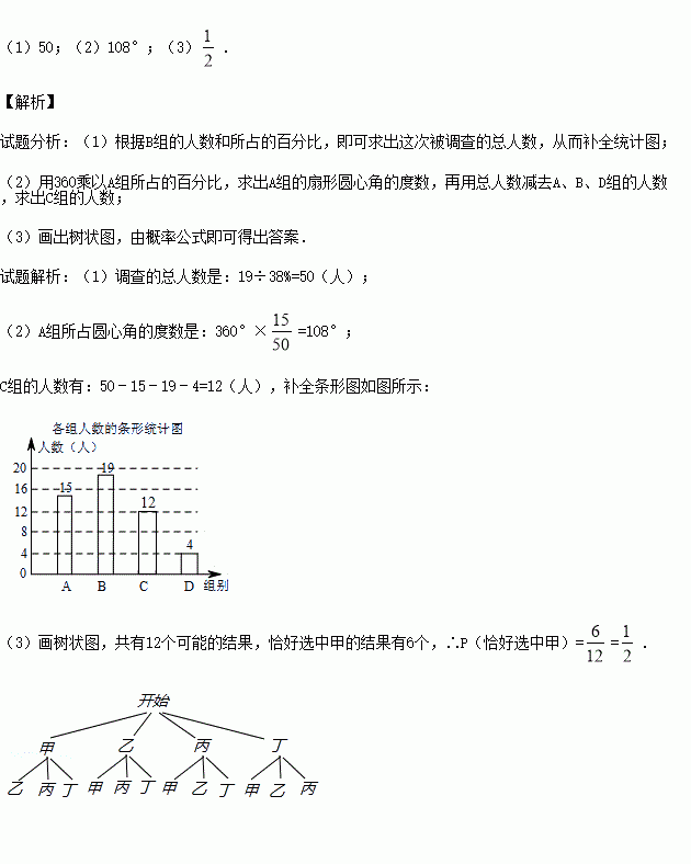 (3)如果小明想从D组的甲、乙、丙、丁四人中随机选择两人了解平时租用共享单车情况,请用列表或画树状图的方法求出恰好选中甲的概率.