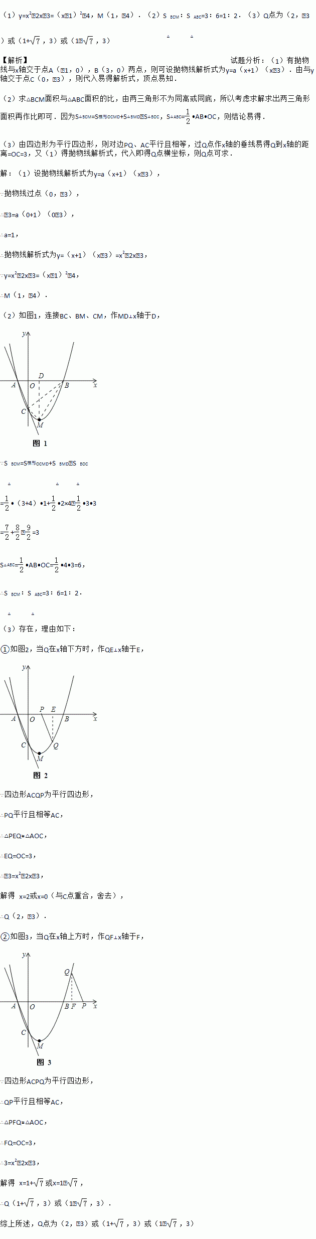 (1)求该抛物线的解析式及顶点M坐标;