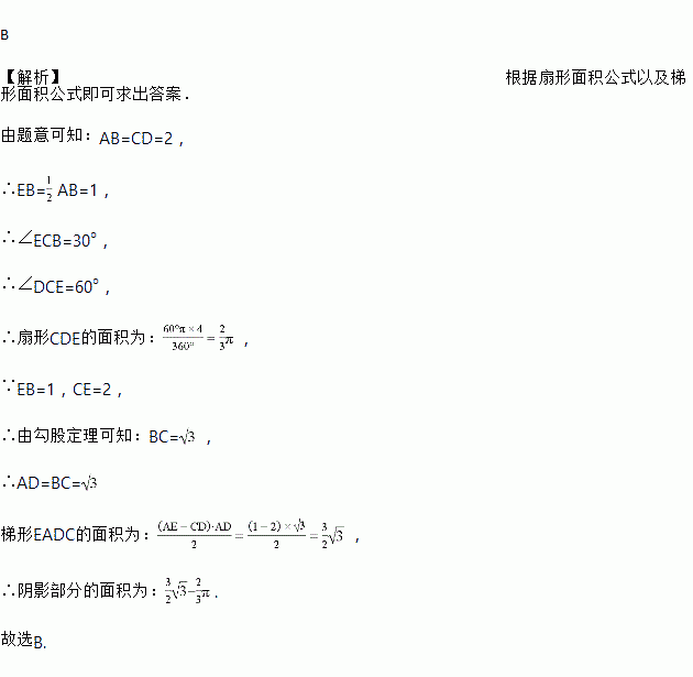 如图,在矩形ABCD中,CD=2,以点C为圆心,CD长为半径画弧,交AB边于点E,且E为AB中点,则图中阴影部分的面积为( )