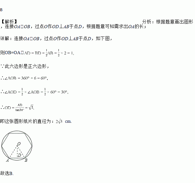 如图,有一个边长为2cm 的正六边形纸片,若在该纸片上剪一个最大圆形,则这个圆形纸片的直径是 ( ) .