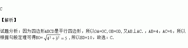 如图,平行四边形ABCD的对角线AC与BD相交于点O,AB⊥AC.若AB=4,AC=6,则BD的长为().