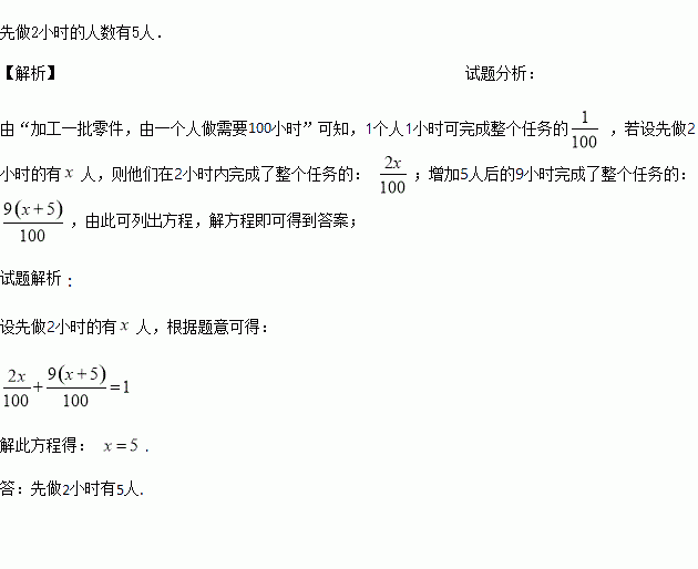 加工一批零件,由一个人做需要100小时,现在计划先由若干人做2小时,再增加5人做9小时,恰好完成任务.假设这些人的工作效率相同,求先做2小时的人数有多少?