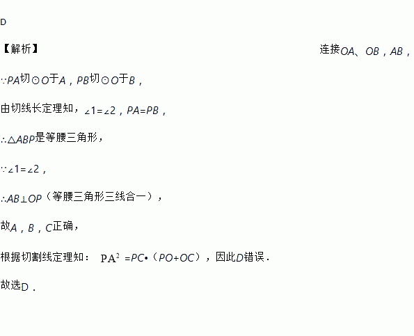 如图,PA切⊙O于A,PB切⊙O于B,OP交⊙O于C,下列结论中,错误的是( )