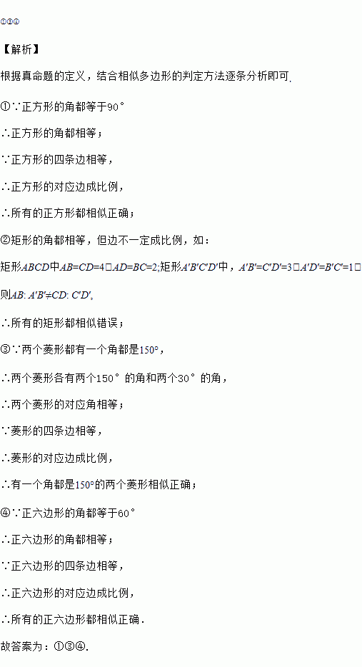 下列命题:①所有的正方形都相似;②所有的矩形都相似;③有一个角都是150°的两个菱形相似;④所有的正六边形都相似.其中是真命题的有______________.(填序号)