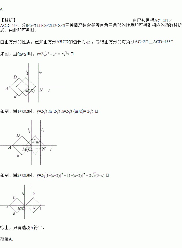 ,对角线AC在直线l上,且点C位于点M处,将正方形ABCD沿l向右平移,直到点A与点N重合为止,记点C平移的距离为x,正方形ABCD的边位于