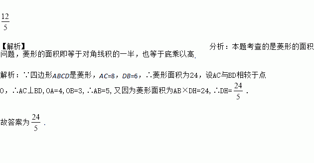 如图,四边形ABCD是菱形,AC=8,DB=6,DH⊥AB于H,则DH等于__________.