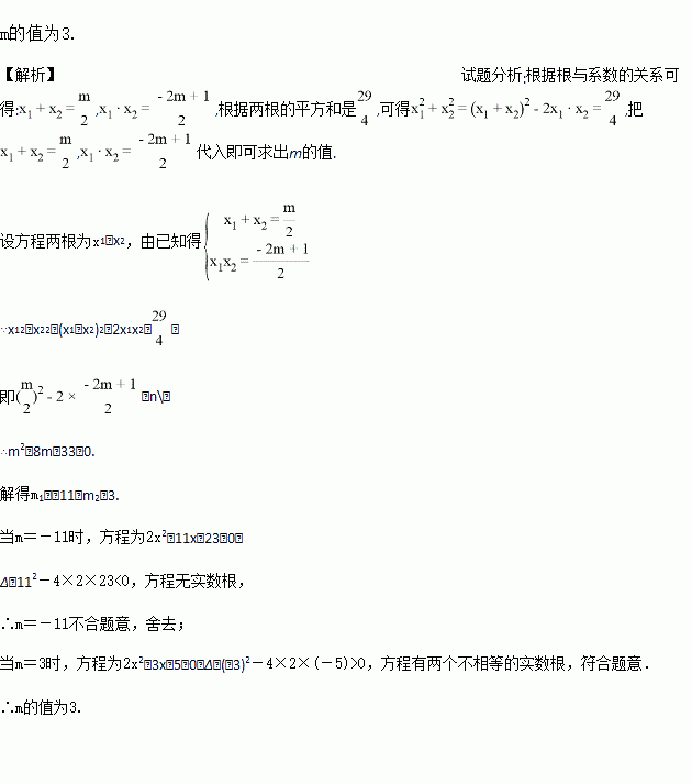 已知关于x的一元二次方程2x2-mx-2m+1=0的两根的平方和是,求m的值.